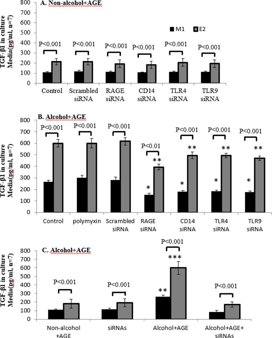 Treatment of alcohol+ AGE in Figure 7B increased about 1-time TGF-β1 protein in E2, compared with its control M1 macrophages (600.22 vs.264.68pg/ml, p< 0.001). Addition of siRNAs of RAGE, CD14, TLR4 and TLR9 partially decreased its protein by 17-34% compared with its E2 with treatment of alcohol+ AGE, and by 31- 42% in M1 cells, respectively. There is no effect of polymyxin and scrambled siRNA on alcohol+ AGE- induced TGF-β1 generation in both E2 and M1 cells Figure 7A.