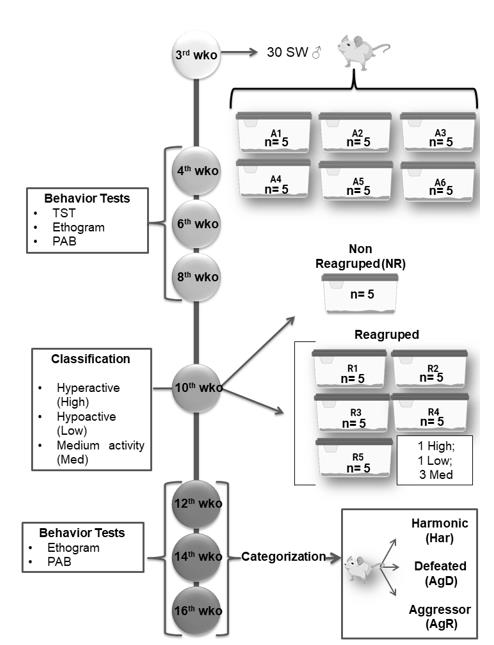 Three-week-old male Swiss Webster mice were grouped into five groups (n = 5 in each group), and behavioral tests, such as the tail suspension test (TST), ethogram and pattern of aggressive behavior (PAB), were performed at the 4th, 6th, and 8th weeks of life. At the 10th week of life, through mobility in the TST, they were classified as hyperactive (High), hypoactive (Low) and medium mobility (Med) and selected for regrouping. Some of the animals were regrouped into five groups with one high animal, one low animal and three Med animals in each group. Regrouping represents a situation of social stress for animals. A group of 5 animals was not regrouped (NR). They served as the social stress negative control. In the 12th, 14th and 16th weeks of life, we performed aggressive ethograms and PAB. At the 16th week of life, the regrouped animals were categorized as harmonic (Har), defeat or attacked (AgD) and highly aggressive (AgR). All MSA were repeated four times.