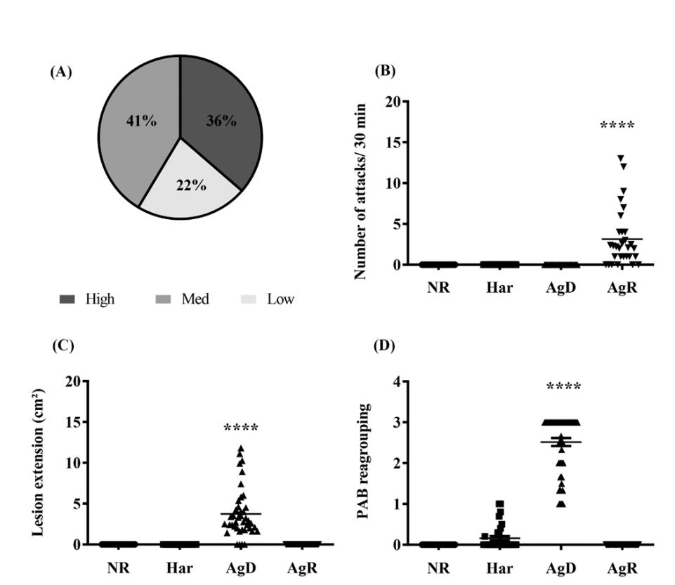 Figure 2: Evaluation of behavioral parameters in social stress. (A) Distribution animal’s according to the mobility profile obtained by TST for regrouping in the 10th week of life. In the grouping we obtained: Dark green: Hyperactive (36%); Green: Medium (41%); Light green: Hypoactive (22%); (B) Number of attacks/30 min according to the categorization of animals in NR (not regrouped), Har (harmonic), AgD (atacked) and AgR (aggressive); (C) Lesion extension (cm2) according to the behavioral categories of animals in NR, Har, AgD and AgR; (D) Evaluation of the pattern of aggressive behavior (PAB) after the regrouping. The values were expressed according to the individual results of the mice from four independent experiments. **** Corresponds to the statistical significance (p <0.0001) between AgR and the other categories and AgD and the other categories by the nonparametric Kruskal-Wallis and Dunn’s tests.