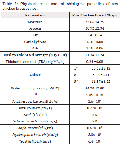 Physicochemical and Microbiological Properties of Raw Chicken Breast Strips: The chemical composition of raw chicken breast strips is presented in Table 3. Moisture, protein, fat, carbohydrate and ash contents of raw chicken breast strips were (73.66, 20.72, 2.4, 1.18 and 1.18g/100g respectively. These results agree with the data obtained [25] who found that moisture, protein, fat, and ash contents of raw chicken breast meat were 75.10, 22.90, 0. 78, and 1.30g/100g respectively. Total volatile based nitrogen (TVBV) (mg/100g) and thiobarbituric acid milligrams of malonaldehyde (TBA) mg / kg of raw chicken breast strips were (11.34 mg/100g and 0.24 (MA) / kg), respectively. These results agree with the data obtained [26]. Data presented in Table 3 showed that the color values (L*, a*, and b*) of raw chicken strips were 55.6, 3.2 and 11.5 respectively. While water holding capacity (WHC) and pH values of raw chicken strips were 44.2 and 5.09 respectively. These results agree with the data obtained [14,27]. Total aerobic bacterial, coliform, E. coli, salmonella, staph. positive coagulase, psychrophilic bacteria and yeast and mold counts of raw chicken breast strips were presented in Table 3. Total aerobic bacterial, coliform, salmonella, staph. aureus, psychrophilic bacteria and yeast and mold counts were 2.6× 105, 0.72× 102, ND, ND, 0.67× 102, 3.3× 106 and 6.4× 101 respectively. These results agree with the data obtained [28,30].