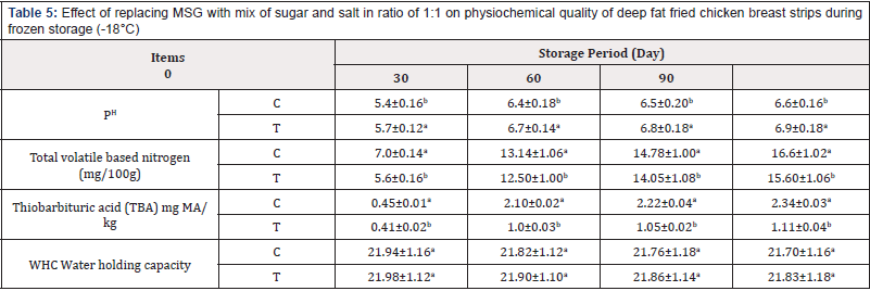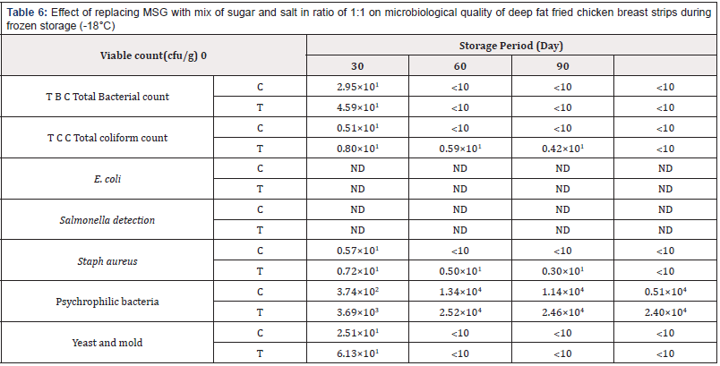 Sensory Evaluation of Deep Fat Fried Chicken Breast Strips During Frozen Storage (-18°C): Poultry meat is a nutritious food, and it is consumed all over the world because of its relatively low cost and low-fat content. However, it is highly perishable with a relatively short shelf life even when it is kept under refrigeration. Thus, developing more appropriate technologies for its preservation could be highly useful, to increase the shelf life of meat products [47]. Statistical analysis appears a significant difference in sensory evaluation between both samples. Treatment containing MSG (control) had the higher sensory proprieties (color, taste, crispness, odor, and acceptability) than that treatment containing mix of sugar and salt as MSG replacer (Table 7). The overall acceptability of deep fat fried chicken breast strips during frozen storage (-18±1°c) were significantly higher in (C), while it was significantly lower in the sample treated with mix of sugar and salt as MSG replacer. Statistical analysis appears a significant difference in overall acceptability between both samples. These results agree with those obtained [31,32,38,43,48-52].
