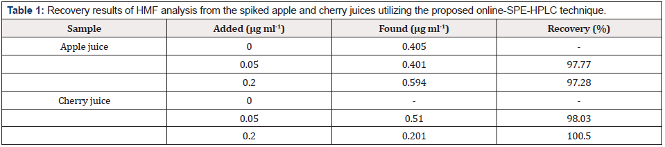 The proposed approach was employed for the determination of HMF in some commercial apple and cherry juice samples. The juices were spiked with 0.05 and 0.20 μg ml-1 of HMF and analyzed by the developed online-SPE-HPLC procedures. Acceptable recoveries in all cases proved the high-ability of the developed method for the routine analysis of HMF in different standard/real samples (Table 1).