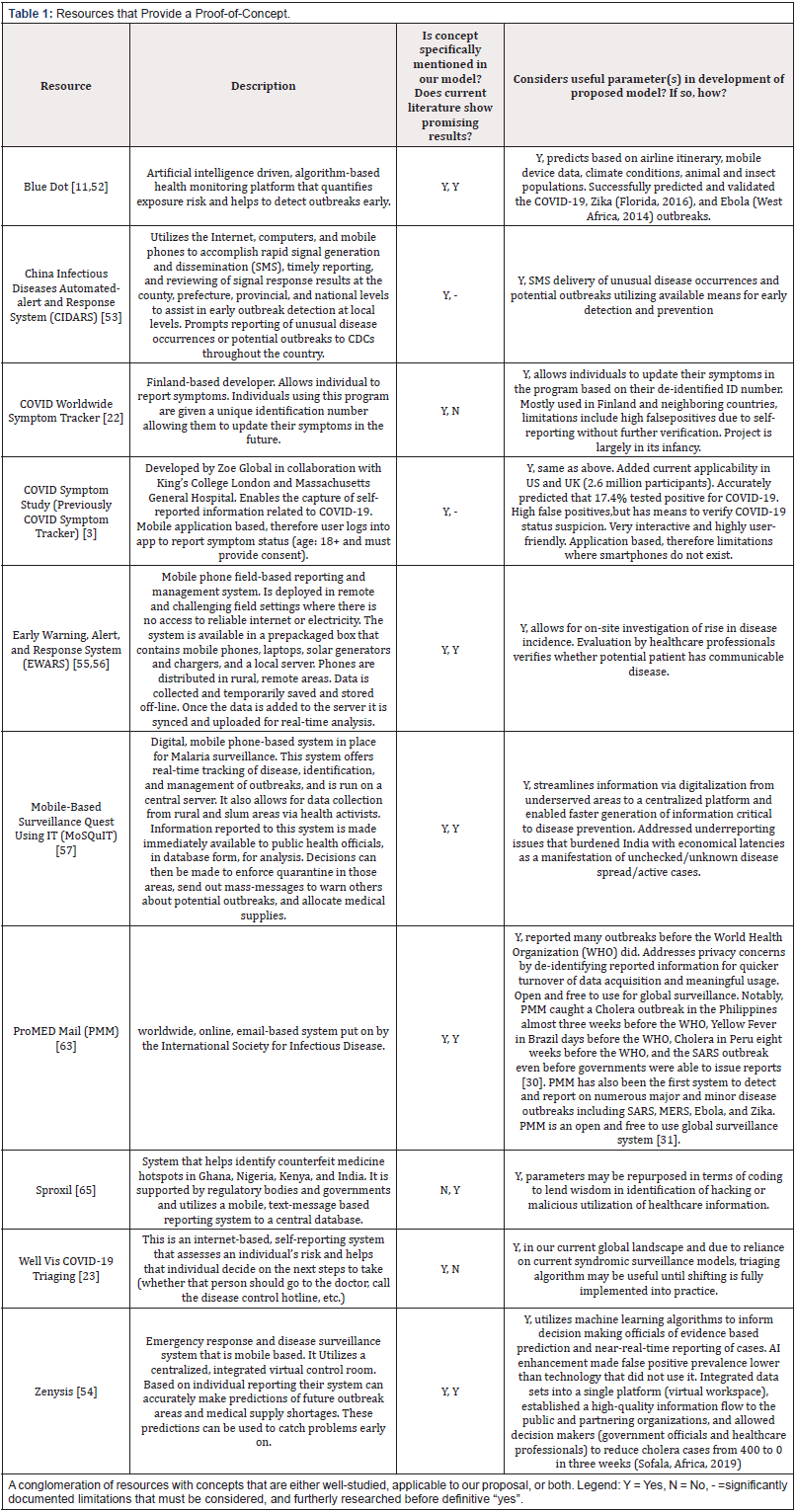 As notorious overfilling of hospitals occurred in the face of the 2020 COVID-19 pandemic in countries across the world, a better system for triaging was made evident. In the clinical setting, a fully automated Deep Learning (DL) system for COVID-19 diagnosis and prognosis may better triage patients based on computed tomographic images of their lungs, thus optimizing medical resource usage in the clinical setting. Additionally, this DL system is also able to differentiate pneumonias (COVID-19 vs. other viral vs. bacterial), thus substantially decreasing the generation of falsepositives [31]. As ML predictive models are developed, DL methods may be employed to amplify important inputs that discriminate and suppress irrelevant variations [32]. On a geographical scale, Blue Dot and Zenysis (Table 1) are AI-based healthcare companies that have utilized aggregated data in thwarting previous epidemics. Their concepts provide prediction models based on meta-data parameters (airline itinerary, disease-carrying vector[s], and cellphone data). Analysis offered by Oxford Insights details the readiness index by which various countries’ governments have the capacity to implement AI technology into their daily practice [33- 37]. In a cost-versus-benefit analysis, financially limited countries may benefit the most in a universally accessible syndromic surveillance paradigm [32]. As larger datasets are integrated, ML and DL-associated costs are expected to increase; however, mitigating economic devastations warrant the investment.