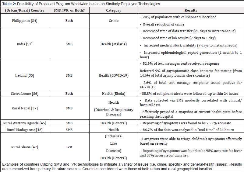 Smartphone-based applications are powerful, but there is concern that their scalability is limited to affluent areas in developed countries, and the concept cannot be extrapolated to rural areas, impoverished cities, or developing countries [38]. Unavailability of transportation is associated with a lack of regular medical care and less use of healthcare services, therefore leading to adverse health outcomes that may be otherwise prevented [39]. Rural populations are less likely to have online access to health information [40], less access to information from primary care physicians and specialists [41], and lower levels of health literacy [42] compared to urban residents. Rural populations, especially minorities, are more unlikely to be able to see a physician for at least one year due to the related costs [43]. In (Table 2), we show extensive global utilization in both urban and rural demographics that have SMS and IVR technologies currently employed. We summarized these findings to show the current successes in utilizing the SMS/IVR route as a means for data collection and information distribution done in an accurate manner. Taken together, user compliance may be enhanced by an automated, streamlined, and digitalized SMS/ IVR syndromic surveillance model, therefore leading to the early detection and prevention of epidemic and pandemic pathogens.