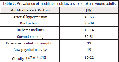 The increase in the rate of stroke in young adults has been evidenced in several studies. However, the rates of stroke in this population differ considerably throughout the world, mainly affecting developing countries [8]. This difference could be explained by the characteristics of each population, such as differences in access to health services, identification and timely mitigation of risk factors [8]. In 2012, the rate of stroke hospitalization in young adults in the U.S. between 2003 to 2004 and 2011 to 2012 increased considerably from 11.2 to 18.0 and from 3.8 to 5.8 per 10,000 hospitalizations/ year, respectively, in ages between 18 and 34 years. On the other hand, in the 35 to 44 years age group, it increased substantially in men (37.7 to 68.2 per 10,000 hospitalization-years) and in women by 44% (from 24.8 to 35.8 per 10,000 hospitalization-years) [9]. By 2013, a high global prevalence of stroke was estimated in young adults between the ages of 20 and 64 years, reaching 11 million people, with a mortality of 1.5 million, noting an increase between 1990 and 2013 of both ischemic and hemorrhagic strokes [5]. In 2015, an increase in the incidence of stroke in young people aged 20 to 44 years was reported, from 17 to 28 per 100,000 populationyears, with a higher incidence in men than in women (31 and 26 per 100,000 population-years, respectively). While in the 45 to 65 years age group the incidence was much higher (171 per 100,000 population-years: men 368 per 100,000 population-years and women 284 per 100,000 population-years) [10]. However, Leppert, et al. [10,11] found in their retrospective cohort study in the U.S. in a court of patients between 2001 and 2014 demonstrated a higher incidence in women than in men in the age range of 25 to 44 years, showing that there may be specific risk factors for women [11-13]. This provides us with useful information for the development of sex-specific strategies in the evaluation and prevention of stroke in young adults [14]. Furthermore, the incidence in European studies varies from 5 to 15 per 100,000 population and up to 40 per 100,000 population-years in African countries [8]. In the USA, the prevalence of stroke in young adults is 10-15% of all cardiovascular diseases [2].
