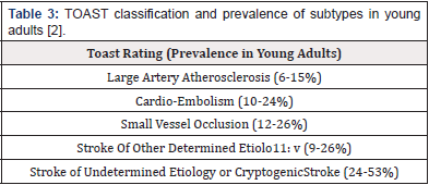 - Ji R, Schwamm LH, Pervez MA, Singhal AB (2013) Ischemic Stroke and Transient Ischemic Attack in Young Adults: Risk Factors, Diagnostic Yield, Neuroimaging and Thrombolysis. JAMA Neurol 70(1): 51-57.