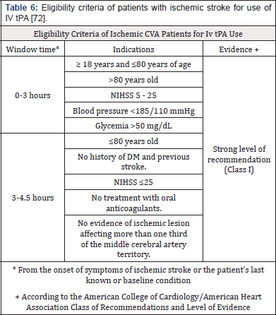 Initial management consists of stabilization of vital signs, use of supplemental oxygen to maintain O2 saturation above 94%, ventilatory support in patients with ischemic stroke and decreased consciousness and/or loss of airway protection reflexes [84]. Maintain adequate tissue perfusion, sustaining lower blood pressure (BP) levels <185 mmHg systolic and <110 mmHg diastolic before starting intravenous thrombolytic therapy [84], adequate temperature and metabolic control, especially optimal blood glucose levels [84-86]. The specific treatment for ischemic stroke consists of intravenous infusion of Alteplase or tissue plasminogen activator, a drug approved in 1996 by the FDA in the USA [87]. The greatest benefit with respect to risks of IV tPA is time-dependent, for this reason it should be indicated as soon as possible in those patients diagnosed with ischemic stroke and who meet the eligibility criteria (Table 6). The dose of IV tPA is 0.9 mg/ kg dose, maximum dose of 90 mg over 60 minutes with the initial 10% of the dose administered as a bolus over 1 minute [84]. The American Heart Association/American Stroke Association in 2019 recommends IV tPA is for those patients who can be treated within 3 hours of the onset of ischemic stroke symptoms. In addition, there is safety with the use of IV tPA between 3 to 4.5 hours following the onset of ischemic stroke symptoms, NIHSS between 5 and 25 points, no history of diabetes and stroke price [84]. Furthermore, with the use of IV tPA between 3 to 4.5 hours is safe and may be as effective in young patients [84]. Although young adults are less likely to have any contraindications to IV tPA and may be treated more frequently than young adults. Dodds, et al. [88] found from a cohort of 173,946 ischemic stroke patients between 2009 and 2015 in the U.S. that young adults are more likely to have delays in the evaluation and treatment of ischemic stroke compared to the older adult. Which young patients were less likely to have a brain imaging study within 25 (62.5%) and 60 (37.0%) minutes of arrival to the emergency department compared with older adult (71.5% and 42.8%) [88].