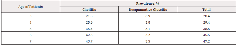 While patients under examination growing, we register a decrease in this pathology. So, if at the age of 3 the prevalence of desquamative glossitis among preschool children was 6.9%, then by the school age of 7 it decreased almost twofold and amounted to 3.5%. These pathologies are temporary in nature and mainly depend on the climatic conditions of the region, the sudden changes in temperature and strong winds. In addition to the above-mentioned factors, the appearance of cheilitis is also caused by frequent licking of the lips. The main prophylaxis of their manifestation is the elementary adherence to normal hygiene standards.