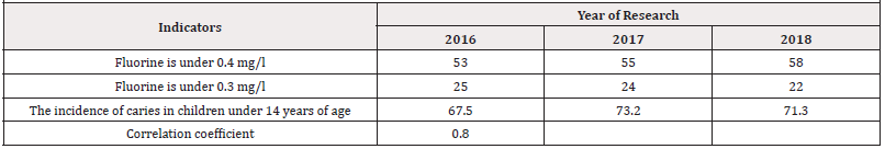 Table 4: The fluorine content in drinking water and the incidence of dental caries in children in Kizlyar (%).