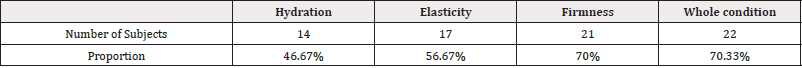 The improvement of the skin conditions regarding hydration in stratum corneum, skin elasticity and skin firmness were shown in Tables 1-3 and Figures 3-5. The hydration in stratum corneum improved significantly after topical application of this formulation for 14 and 28 consecutive days. It increased from 24.75 to 30.9 after 14 days, and during the next 14 days the hydration kept increasing up to 32.12. The skin elasticity and firmness did not change significantly after 14 and 28 consecutive days of topical application of this formulation. The rates of individuals who were very satisfied with the functions of this formulation ranged from 46.67% to 70.33% regarding the improvements in skin hydration, skin elasticity, skin firmness and the whole conditions (Table 4).