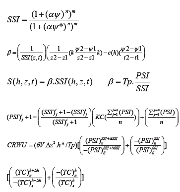 Where MO: Soil Moisture Content (v/v), S: Soil Salinity (ds/m), SSI: Soil Stress Index, PSI: Plant Stress Index, MP: Soil Matric Potential(mpa), PC: Partially Compensated Uptake FC: Fully Compensated Uptake, AVG: Average Plant Stress Index, OP: Soil Osmotic Potential(mpa),ψ= hs: Soil total Potential(mpa), ψ*=hfc: Soil Total Potential at Field Capacity(mpa), “(S(i, j))= Root Water Uptake.C(h)= C: Water Holding Capacity,” “k(h): Unsaturated Hydraulic Conductivity(l/t), n*: days,(“n,m,α): Van-Genuchten Constants.