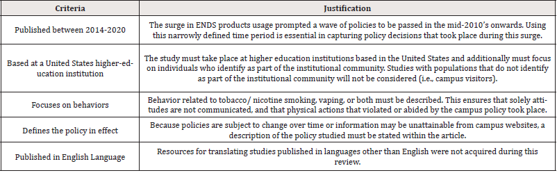 Studies published between 2014-2020 are included because the University of California campuses implemented a strengthened smoke/ tobacco-free policy in 2014 (policy adopted in 2012) and this sparked a change within college campus policy culture throughout the United States [13,17]. Furthermore, the popularity of ENDS substantially increased in the mid-2010s which shifted college vaping culture during this time period [18].
