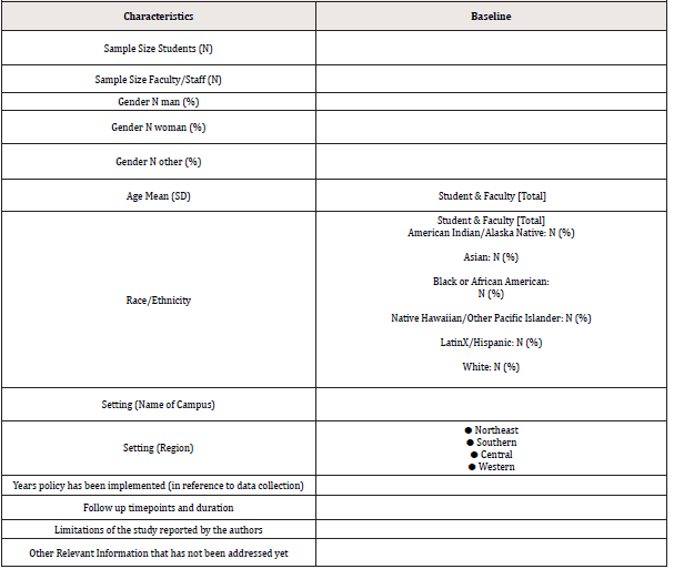 Data Extraction. For each of the selected articles, we will extract data and information based on the abstraction guide created, which is shown in Appendix B. This includes the demographic information of the sample size studied, the type of policy at the college campus and how well it is implemented, the nicotine use behavior of the students, the types of products that they are using, and where they are using nicotine. We will also extract information regarding the geographical location of the college campuses as well as any trends in vaping and smoking behavior.