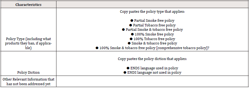 Review Team. The review team is composed of three tobacco control advocates: first, second, and third authors. All three members of the review team are Board Members of the COUGH (Campuses Organized and United for Good Health) Coalition, a statewide movement advocating for comprehensive smoke/tobacco-free policies, education, and treatment services on all colleges and universities in California. COUGH is supported by the California Youth Advocacy Network (CYAN), a statewide organization working to promote smoke/tobacco-free college campuses by providing training and technical assistance to individuals, organizations, and coalitions advocating for commercial tobacco-free communities. The review team is overseen by the fourth author, an expert tobacco control consultant to CYAN and college health professionals working in higher learning institutions.