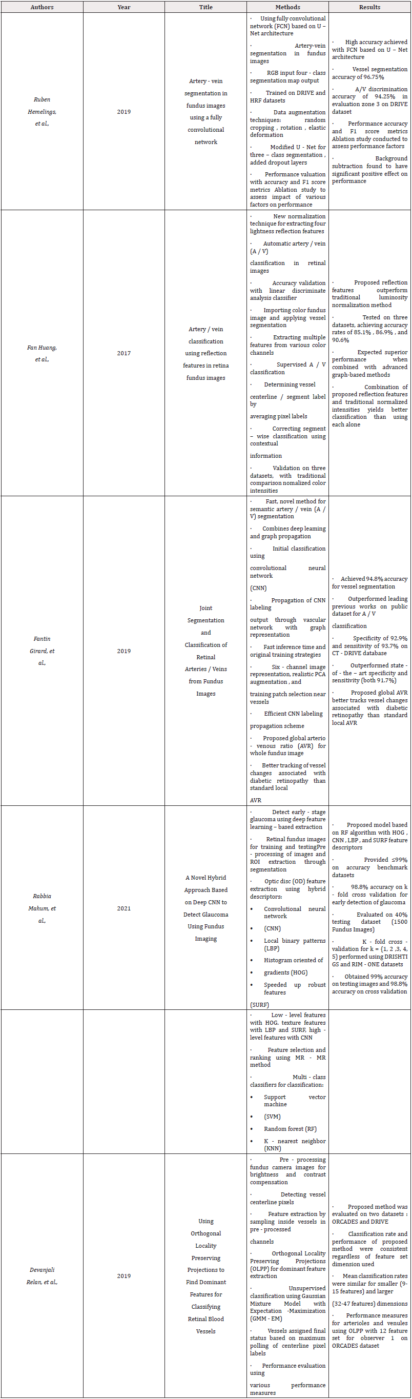 The classification of blood vessels in retinal images has been explored using a range of classification and clustering techniques that leverage various features. Support Vector Machines (SVM) have been employed by numerous researchers [98-100] Vijayakumar, et al., (2016) to analyze width, orientation, Gabor, intensity, and morphological features, as well as to execute feature selection through Random Forest (RF) and graph-theoretic frameworks with vessel tree network topology Estrada, et al., [101].
