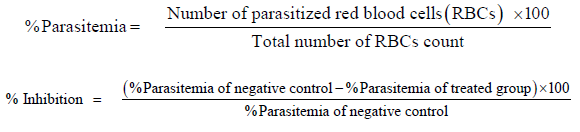 The method explained by Adikwu, et al., 2022 [15] was used. The mice were infected with RBCs containing Plamodium berghei (1×107) intraperitoneally. The mice were grouped into 6 of n=5/ group and allowed for 3 days. Thereafter, the mice were orally treated with AS (12mg/kg/day), KT (7mg/kg/day), and AS/KT respectively for 4 days. The standard control was orally treated with CQ (10mg/kg/day) while the parasitized and normal controls were orally treated daily with normal saline. Tail blood samples were obtained and thin blood films were produced on microscope slides. The slides were fixed in methanol allowed to dry and stained with 10% Giemsa stain. The slides were viewed with the aid of a microscope and the percentage parasitemia and inhibitions were calculated as shown below.