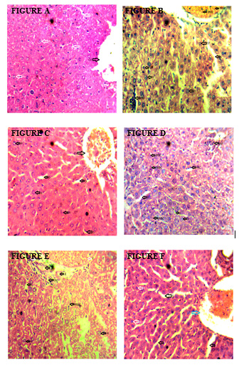 Figure A: Liver of the control mice, Figure B: Liver of parasitized control mice, Figure C: Liver of parasitized mice treated with chloroquine, Figure D: Liver of parasitized mice treated with artesunate, Figure E: Liver of parasitized mice treated with ketoconazole, Figure F: Liver of parasitized treated with artesunate/ketoconazole.
