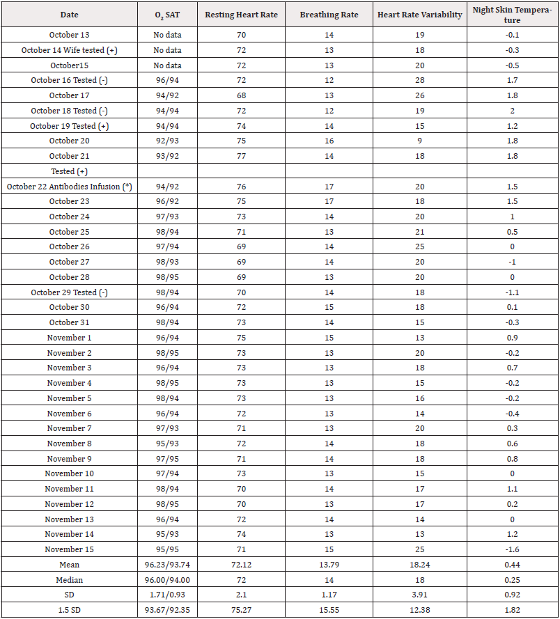 Smart watches can be used to collect data from patients at risk for COVID Banks, et al., (2021) [26]. Data from the patient’s smart watch were recorded from October 13 to November 15, as presented in Table 1. Data were analyzed using SPSS [27]. The patient was teaching a basic statistics class at Highland Community College that fall, and this became the second research project in which the class was involved, the first previously published in this journal [28] (Table 1).