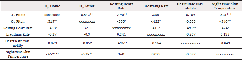 Measures. Oxygen saturation levels were measured on a oximeter at the patient’s home and as measured by the patient’s smart watch, as averaged over each day. Resting heart rate was measured by the smartwatch as averaged over each day. Breathing rate, heart rate variability, and night skin temperature (above/below 98.6 degrees) were also measured by the patient’s smartwatch, averaged over the day. Complete data are reported in Table 1 and correlations among the vital signs are presented in Table 2, showing interrelationships among the different vital signs (Table 2).