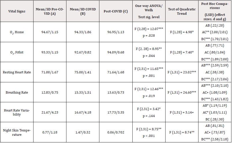 Overall tests. One-way analyses of variance yielded statistically significant results for all six health outcome variables while the Welch test yielded five significant results. Five of the quadratic trends were statistically significant, while a sixth was not significant (p<.10). From Table 1, it can be seen that all of the six measured health outcomes improved at least somewhat within three days of medical treatment (infusion of monoclonal antibodies). Early shifts in health outcomes (pre-COVID to during COVID infection). The largest deteriorations for health outcomes occurred for resting heart rate and breathing rate with smaller changes for both measures of oxygen saturation, heart rate variability, and night skin temperature. The changes were small enough for night skin temperature yet lower post infection to suggest that an increased night skin temperature might have been a leading indicator of an oncoming COVID infection. Recovery from COVID (during COVID to after COVID infection). Except for heart rate variability, all health outcomes featured very substantial (effect sizes of 1.43 to 2.58) and statistically significant (p<.001) improvements after monoclonal antibodies treatment of the patient. Heart rate variability improved but only slightly, possibly a factor in long COVID (slower heart tissue recovery) and remained significantly (p<.05) well below (effect size of at least 1.03) initial levels even after treatment. While both measures of O2 levels improved upon pre-COVID levels as well as COVID levels, resting heart rate, breathing rate, and night skin temperature did not return completely to pre-COVID levels, even after treatment (Table 3).