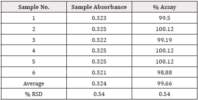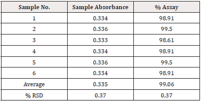 Acceptance Criteria: The % RSD from the six sample preparations should be no more than 2.0%. The individual % Assay should not less than 98.0% and not more than 102.0%.
