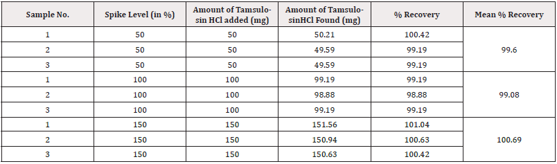 To determine the accuracy of the test method samples were prepared by spiking Tamsulosin HCl raw material with the equivalent amount of placebo at 50%, 100% and 150% of the target concentration. Three samples were prepared at each concentration level. The average % recovery of Tamsulosin HCl was found to be within the limits. The results were summarized in (Table 4).