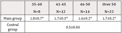 The results of an EIA to determine the detectability of the level of C-terminal telopeptide of type I collagen (CTX) in the examined patients showed that among 55 women of the main group, 37 had in an increase in the level of CTX-1 in the blood, which accounted for 67.3% of cases. Whereas in the control group of women (37 subjects) only 3 women had an increased level of CTX-1, which accounted for 8.1% of cases (Table 1). The results obtained indicate the presence of a high level of CTX-1 in the blood of patients with PHGP. An analysis of the quantitative assessment of the C-terminal telopeptide of type I collagen in the blood of patients with PHGP revealed an increase in the level of CTX-1 in the blood of patients with PHGP by 4.4 times compared with the indicators of the healthy controls and averaged 2.2±0.17 ng/mL and was statistically significant. (P<0.05) (Table 1). As follows from the table, the level of the C-terminal telopeptide of type I collagen in the control group averaged 0.5±0.06 ng/mL. The obtained data were analyzed taking into account the age aspects of the main group of women (Table 2).