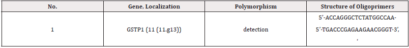 In terms of age, 15 women aged 19 to 25, 7 women aged 26 to 30, 2ones aged 31 to 36, and2 ones aged over36. Molecular genetic studies of the IIe 105 Val polymorphism of the GSTP1 gene were carried out with the informed consent of the patients. Information about gene sequences and the structure of primers was obtained taking into account the original literature source and from Gene- Bank. The characteristics of the genetic marker and the sequence of the synthesized oligoprimers are shown in (Table 1).