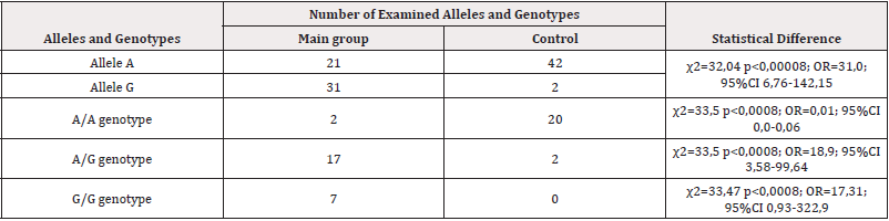 a) Allele G and the association of polymorphism of the heterozygous genotype IIe 105 Val of the GSTP1 gene are markers of an increased risk of developing Asherman syndrome in women of the Uzbek population. (P<0.05). Allele A and the functionally favourable A/A genotype are reliable functional markers of the development of pathology (χ2=32.04 p<0.00008; OR=0.03; 95%CI 0.01-0.15).