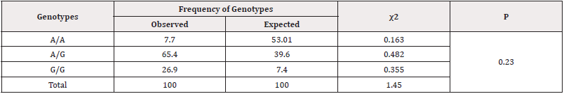 Table 5: Expected and observed frequency of distribution of genotypes according to HWE of the IIe 105 Val polymorphism of the GSTP1 gene in the control group.