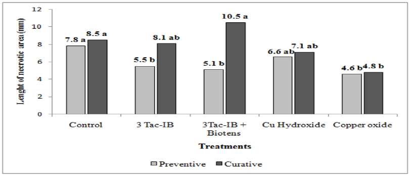 Copper oxide was able to reduce the disease in the inoculated site in a curative and preventive way compared to the control, which was not observed in treatments with copper hydroxide. On the other hand, 3 Tac-I/Beta showed no activity when it was sprayed curatively (Figure 2).