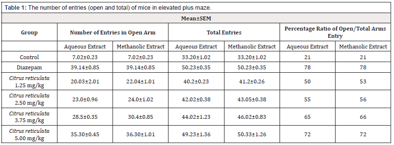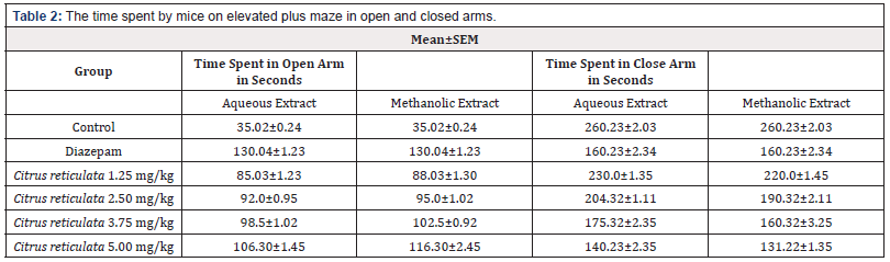 Results: The results revealed that, both extracts treated animals have shown significant anxiolytic activity. From the results it was evident that citrus peel extract of Citrus reticulata exhibited significant anxiolytic activity.