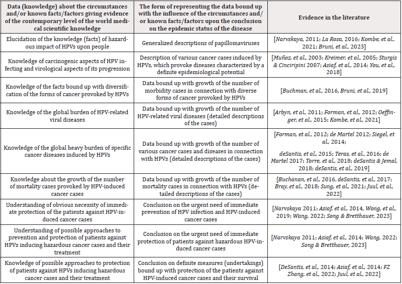 Column 2 in Table 1 represents sequentially formulated knowledge of the form of representing the data bound up with the influence of circumstances and/or known facts/factors upon the conclusion on the epidemic status of the disease. This may be, e.g., description of (i) the influence of HPVs, (ii) cancer cases. This form of representation reflects the level of understanding (by the specialists) of the influence of circumstances and facts/factors upon the situation.