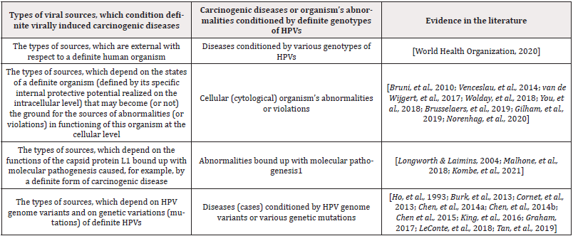 It is possible to draw the following additional conclusions. 1. On the whole, the author’s findings represent issues which seem to be well-known ones, in the aspect of systems science. These findings, which are based on a systemic knowledge- based approach, have uncovered the knowledge about the following types of sources of carcinogenic diseases bound up with HPVs: (1) globally conditioned sources, which are external with respect to a definite human organism, and which condition the diseases at the expense of (a) various HPV genotypes or (b) genetic variations (mutations) of HPVs; and (2) abnormalities in a definite organism, which are determined by its internal conditions: (i) cytological (intracellular level) abnormalities, (ii) molecular and (ii) genetic abnormalities (Table 2).