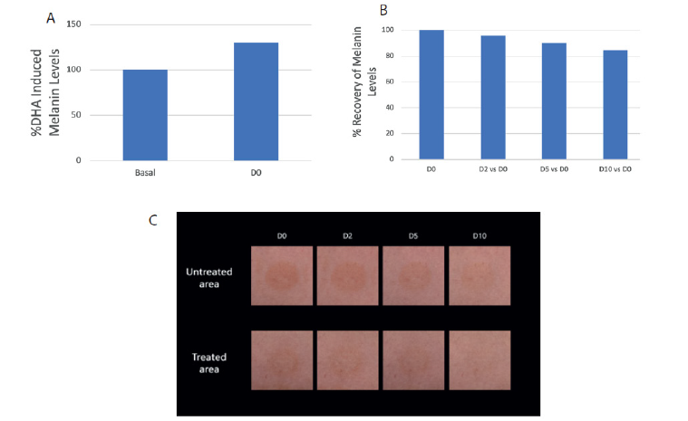 In regeneration test results showed that exposure to 10% DHA significantly increased skin melanin levels by 30.8±1.76 %, comparing each volunteer with its own basal control (before DHA exposure) as shown in (Figure 4A). In this context, when 0,75% Hybrosome cream were topically applied after DHA, results showed a statistically significant reduction of melanin levels upon treatment. A significant reduction by 4.42 ± 0.85, 10.18 ± 1.31 % and 15.53±1.63 % was observed after 2, 5 and 10 days, respectively (Figure 4B). Images of 0,75% Hybrosome + base cream treated and untreated areas at time points of D0, D2, D5 and D10 are included in (Figure 4C).