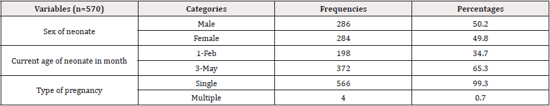 Data were entered into Epi Data version 3.1 and then exported to SPSS version 24 statistical package for analysis. Data cleaning was performed to check for missed values and then descriptive analysis such as proportions, percentages, median, tables and graphs were used. Multi-collinearity was checked, and logistic regression analysis was done using Hosmer-Lemeshow model goodness fit test. Variables significant in bivariate analysis were entered in multivariate analysis to identify the independent association of variables with health care seeking behavior of mothers towards neonatal danger signs. Finally, significant independent association was interpreted at P-value of less than 0.05 with 95%confidence interval (Tables 1-6).