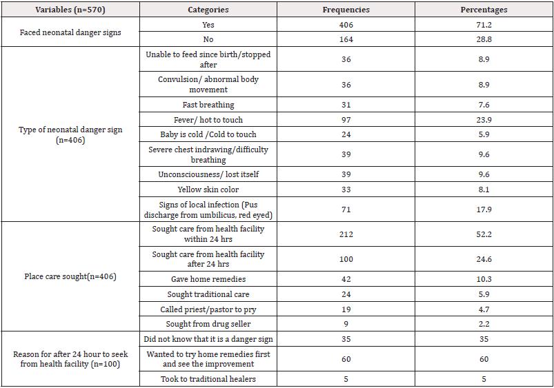 - Molla G, Gonie A, Belachew T (2017) Health care seeking behaviour on neonatal dangersigns among mothers in Tenta District, NortheastEthiopia: Community based cross- sectional study. International Journal of Nursing and Midwifery 9(7): 85-93.