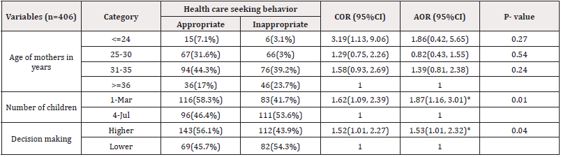 Result: Appropriate health care seeking behavior was 52.2% with [95%CI: 47.0-57.1%]. Mothers who had a number of children from 1-3 were 1.87 times more likely to seek appropriate health care [AOR: 1.87, 95%CI: 1.16, 3.01]. Mothers who had higher decision-making ability were 1.53 times more likely to seek appropriate health care [AOR: 1.53, 95%CI: 1.01, 2.32].