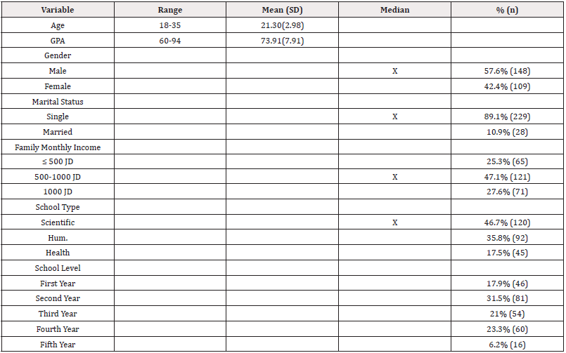 The results of the demographic characteristics for the study participants (n=257) revealed that the mean age of the participants was 21.3±2.98 years and the great point average (GPA) of the participants was 73.91%±7.91. More than half of them where males 57.6% (n=148), 46.7% (n=120) in scientific schools, 35.8% (n=92) in humanitarians schools, while 17.5% (n=45) in health schools. The majority of the participants 60.3% (n=155) reported that they live with their families, 23.7% (n=61) lives with other students in private house, and 16% (n=41) lives in students dorm. 89.1% (n=229) where single, 8.9% (n=23) where married, and 1.9% (n=5) where divorced, 25.3% (n=65) of the participants making less than 500JD monthly family income, while the majority 47.1% (n=121) making between 500-100 JD, and only 27.6% (n=71) making more than one thousand JD per month. 17.9% (n=64) where first year, 31.5% (n=81) second year, 22% (n=54) third year, 23.3% (n=60) fourth year, while only 6.2% (n=16) fifth year. Table 1 presents the participants demographic characteristics (Table 1).