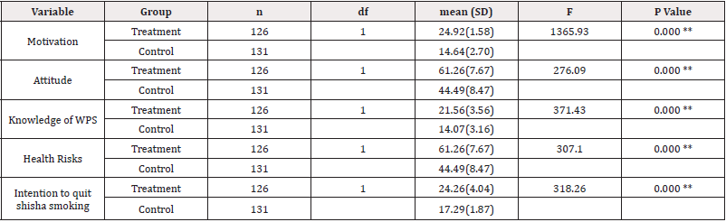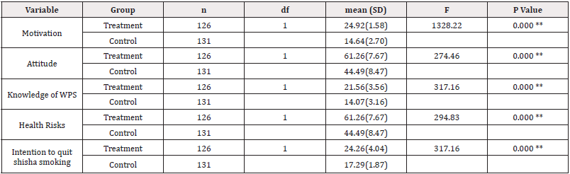 Results: The difference in the educational program posttest total score (dependent variables) were statistically significant: motivation (F{1, 257}=1365, p=0.000), attitudes (F{1,257}=276, p=0.000), knowledge of health effects (F{1, 257}=307, p=0.000), health risks (F{1,257}=329, p=0.000), and intention to quit smoking shisha (F{1,257}=318, p=0.000).