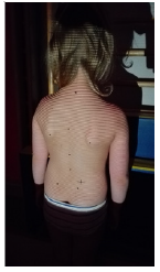 Marking points on the back skin of the examined: the top of the spinous process of the last cervical vertebra (C7), the spinous process being the top of the thoracic kyphosis (KP), the spinous process being the top of the lumbar lordosis (LL), the transition place from thoracic kyphosis to lumbar lordosis (PL), the lower angles of the scapulae (Łl and Łp), the posterior upper iliac spines (Ml and Mp), and the S1 vertebra. A white necklace was put on the subject's neck to clearly mark the B1 and B3 points. Long hair up to reveal C7 point.