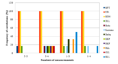 A detailed analysis of the boys' results showed that in the restitution of the value of posture features with all fitness features in the first minute (third measurement) and in the second minute (fourth measurement), the most frequent relationship was between the asymmetry of the verticality of the torso (KPT) and the angle of the pelvic tilt to the left (KSM-). The analysis of restitution in terms of features of habitual posture (first measurement) and the end of the first minute after the load removal (third measurement) showed that the amount of restitution of the vertical asymmetry of the trunk (KPT), the angle of pelvic tilt to the left (KSM -) and the lumbar lordosis angle (KLL) were the most frequently related features of physical fitness. In terms of features of the habitual posture (first measurement) and the end of the second minute after the load removal (fourth measurement), restitution of the value of the torso vertical asymmetry features (KPT) and pelvic tilt to the left (KSM-), were the most frequently related results, (Figure 8).