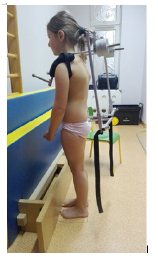 A custom-designed diagnostic frame was provided to ballast the body posture (utility model no. W.125734) (photo 2). The presence of an assistant during the examination was dictated by the need to minimize the time from the load removal to the second registration of the value of the posture features. Every effort has been made to ensure that the custom-designed loaded frame was individually adapted to the type of child's body structure. The adopted 10-minute load time was the average time to walk from the place of residence given in the questionnaire completed by the parents [10]. However, the load was determined by averaging the weight of school supplies to 4kg carried by first-class children from a randomly selected primary school. Selected features of body posture were measured in 4 positions. The first position - habitual position, (Picture 1). Second position - posture after 10 minutes of asymmetric loading on the back (in the last 5 seconds), (Picture 2). Third position - posture one minute after the load removal, Picture 1. Fourth position - posture two minutes after the load removal, Picture 1.