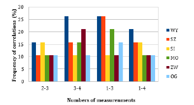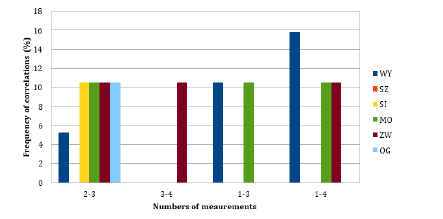 Figure 8: Note*: 2-3 Restitution of the values of body posture features after first minute of the load removal (between 2nd and 3rd measurement) 3-4 Restitution of the values of body posture features after second minute of the load removal (between 3rd and 4th measurement) 1-3 Restitution of the values of habitual posture features after first minute of the load removal (between 1st and 3rd measurement) 1-4 Restitution of the values of habitual posture features after second minute of the load removal (between 1st and 4th measurement) WY - Endurance; SZ - Speed; SI - Strength; MO - Force; ZW - Agility; OG - Overall Practice Figure 6: Frequency of signifficant correlations of physical fitness features with restitution of body posture features among 7-year-old boys n=65N=30.