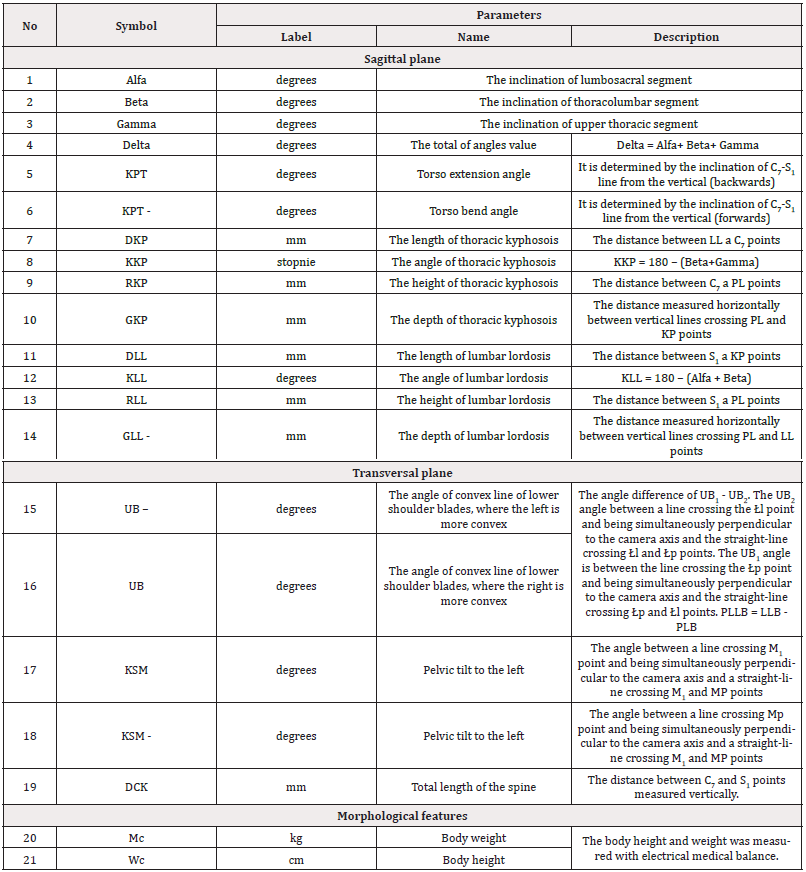 The applied method, which uses the phenomenon of the projection moiré, defines several dozen features describing the body posture. For statistical analysis, 19 angular and linear features of the spine, pelvis, and torso in the frontal plane as well as body weight and height were selected. It was guided by the need of the most reliable and spatially complete look at the child's body posture, which allowed us to fully identify the measured discriminants, (Table 1), (Figures 1-5).