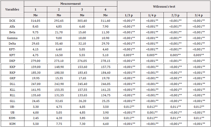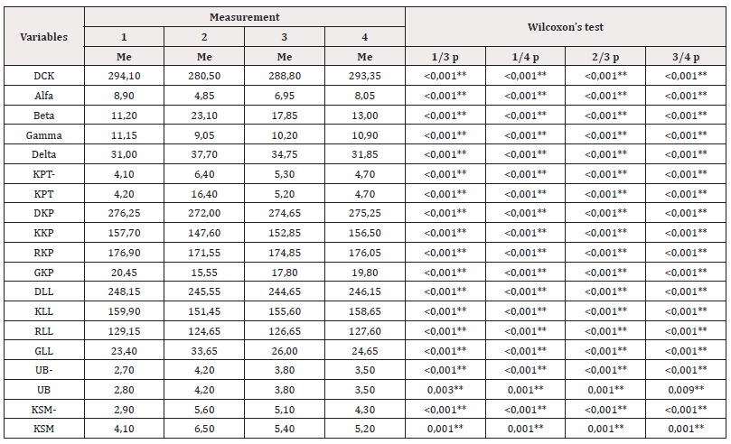 The analysis of the study results was performed using the IBM SPSS Statistics 26 programme. At the initial stage, the Shapiro-Wilk and Kołmogorow-Smirnow tests were used to ensure if the distributions of the analyzed variables were consistent with the normal distribution. For most of the variables, there were statistically significant deviations from the normal distribution at the level of p <0.05. Therefore, it was decided to use tests and non-parametric coefficients in the statistical analysis. The Wilcoxon rank test was used to determine whether there was a statistically significant difference (change) between two measurements (in the same group) of the quotient variable whose distribution was significantly different from the normal one. The following symbols were used in the tables: M - arithmetic mean, Me - median, SD - standard deviation, Z - Wilcoxon test statistic, "p" - significance of the Wilcoxon test. The level of significance was set at p <0.05, marked as *, and additionally, the significance level p <0.01, marked as **. Thus, if p <0.05 or p <0.01, then the difference between the measurements was statistically significant. The Spearman's rho correlation coefficient was used to determine whether there were statistically significant correlations between the variables measured at the quotient level, which distribution significantly differed from the normal one. The level of statistical significance was set at p <0.05, marked as *, and additionally, the level of significance p <0.01, marked as **. Thus, if p <0.05 or p <0.01, then the correlation between the variables was statistically significant. If the correlation was statistically significant at the level of p <0.05, then the correlation coefficient rho should be interpreted. It could take values from -1 to +1. The more distant it was from 0, and the closer it was to -1 or +1, so the correlation was stronger. Negative values meant that as the value of one variable increased, the value of the other variable decreased. On the other hand, positive values indicated that as the value of one variable increased, the value of the other variable increased, too. In the individual tables of correlation, only the variables were considered (in the rows), which at least one statistically significant result was recorded for.