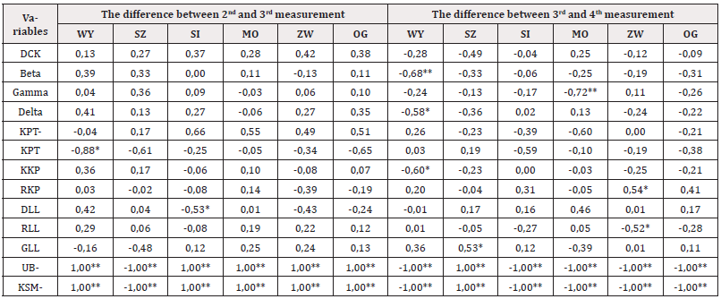 By examining the differences between the 1st and the 4th measurements, it turned out that the greater the strength, the smaller the differences in the angles of the upper thoracic spine (Gamma), the length of the lumbar lordosis (DLL), and the pelvic tilt to the left (KSM-), and the greater in the angles of the convexity line of the lower angles of the shoulder blades, where the left is more convex (UB-). The higher the speed, the smaller the differences in the angles of the convex lines of the lower angles of the shoulder blades, where the left is more convex (UB-), and greater in the inclination angles of the lumbosacral spine (Alpha), and pelvic tilt to the left (KSM-). The greater the force, the smaller the differences in lumbar lordosis (KLL) angles, pelvic tilt to the left (KSM-), and greater in the angles of convexity of the lower angles of the shoulder blades, where the left is more convex (UB-). The greater the power, the smaller the differences in the pelvic tilt to the left (KSM-), and the greater the differences in the angles of the convexity of the lower angles of the shoulder blades, where the left is more convex (UB-). The greater the agility, the smaller the differences in the pelvic tilt to the left (KSM-), and the greater in the angles of the convexity line of the lower angles of the shoulder blades, where the left is more convex (UB-). The greater the overall efficiency, the smaller the differences in the pelvis tilt to the left (KSM-), and the greater the differences in the angles of the convexity of the lower angles of the shoulder blades, with the left more convex (UB-), (Table 5).