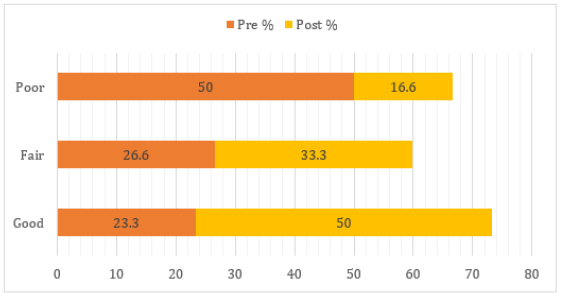 Table 2 shows that the total level of knowledge 23.3% of caregivers regarding chronic diseases is good before telenursing application in comparison with 50 % after telenursing application. In addition, 33.3% of caregivers are Competent in their care for elderly patient with chronic disease before telenursing versus 58.3 % after telenursing application. There are statically significant differences (P value 0.000) (Table 2) (Figures 2,3).