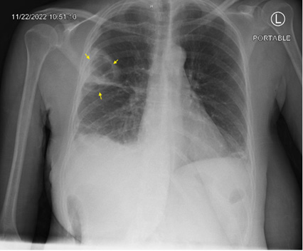 Figure 1: Single view chest X-ray showing thick walled cavitary leision in the right upper lobe 5.7x4.3cm; Yellow Arrows.