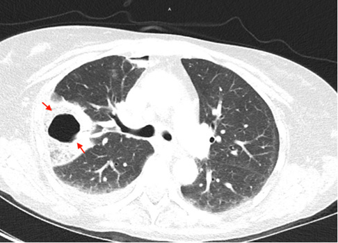 A 53year old woman with a history of alcohol use disorder, COPD, asthma and >20 pack year smoking history presented to the emergency department for two days of worsening shortness of breath and cough with rusty brown sputum and occasional streaks of blood. She denied any fever or chills but endorsed night sweats which she attributed to menopause. On initial evaluation the patient was afebrile, hemodynamically stable and saturating well on room air. Initial work up was positive only for an elevated c-reactive protein of 441. Chest x-ray showed a cavitary lesion in the right upper lobe of the lung measuring 5.7x4.3cm and bibasilar subsegmental atelectasis. Notably, the patient had a chest x-ray 6 months prior that showed no cavitary lesions. The patient was put on oxygen supplementation to assist in resolution of the atelectasis. Subsequent CT chest imaging on the same day showed a 5.1x4.3x5.7 cm thick-walled cavitating lesion in the right upper lobe with right bronchial lymphadenopathy and a small right apical pneumothorax and mild basilar effusion. The patient was put in isolation due to concerns for tuberculosis and further work up was sent including mycobacterial culture along with another infectious workup. Rheumatologic workup was also done secondary to concerns for granulamtosis with polyangitis. She was started on broad coverage with ceftriaxone, doxycycline, and metronidazole (Figures 1-3).